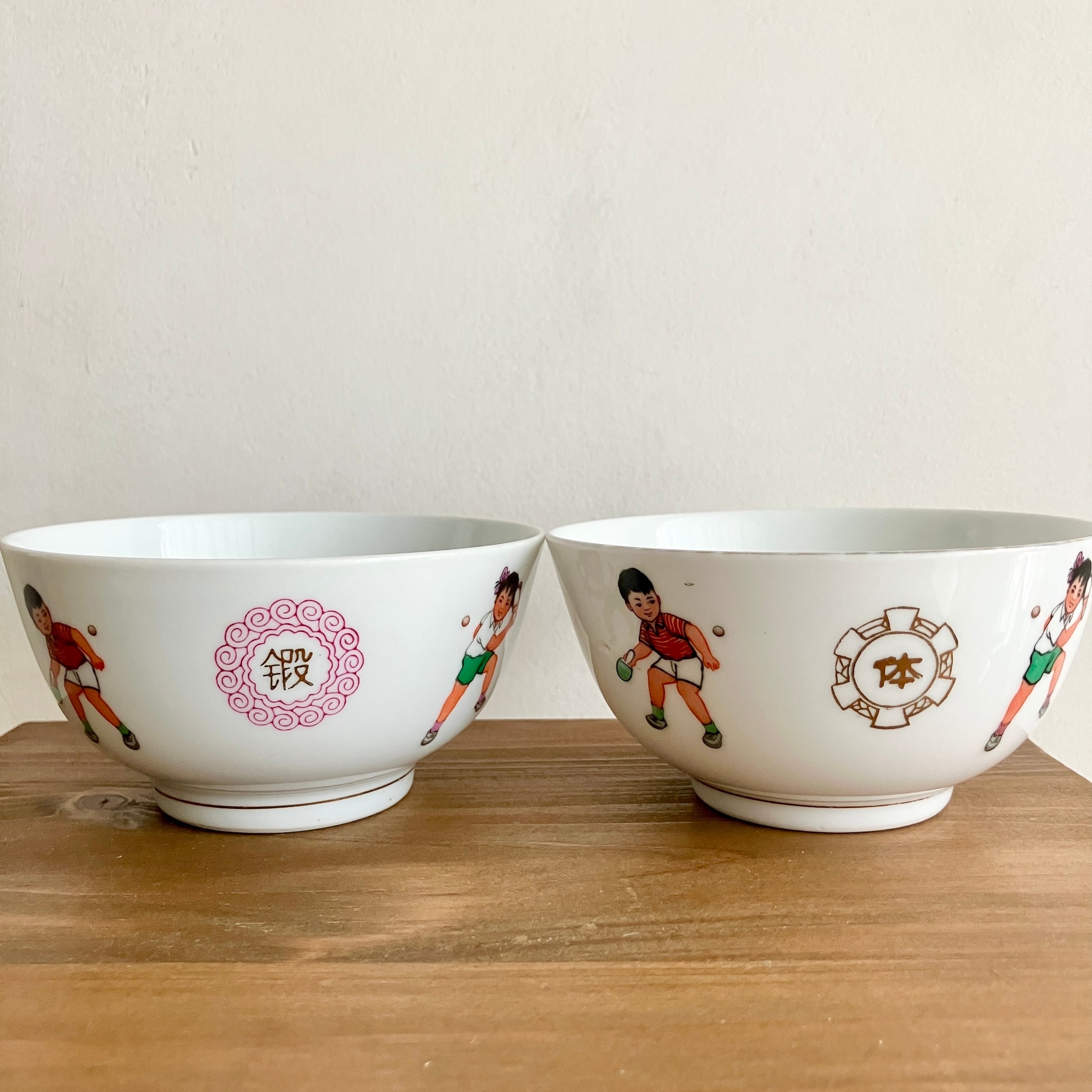 文革期を経たのち、人気が高かったピンポン少年少女のデザインは改革開放期(80年代)の時代の隙間に金彩色を増しデザインを近代化させ、以前の刻印も変えながら作られ特定の百貨店や高級ギフトルートにのみ流れていた可能性がある。がその一方で時代は「欧米向けの花柄」や「現代的なキャラクターもの」へとシフトし、中国自身が新しい商業主義(ブランド)へ移行する激動の時代だったため、古いスローガンを掲げたレトロなデザインは生産数自体極めて少数で短命だったと思われる。そこがこの金文字の身体鍛錬ボウル。実は市場で見かける機会は、初期モデルよりも遥かに稀であり、それゆえ貴重と言えるものです。