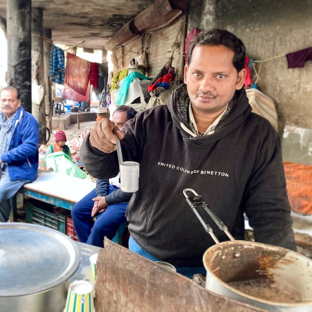 チャイワラがボウルから鍋にミルクを注ぐ際に